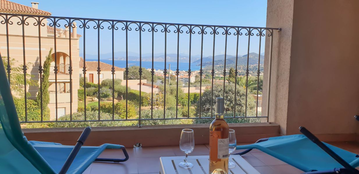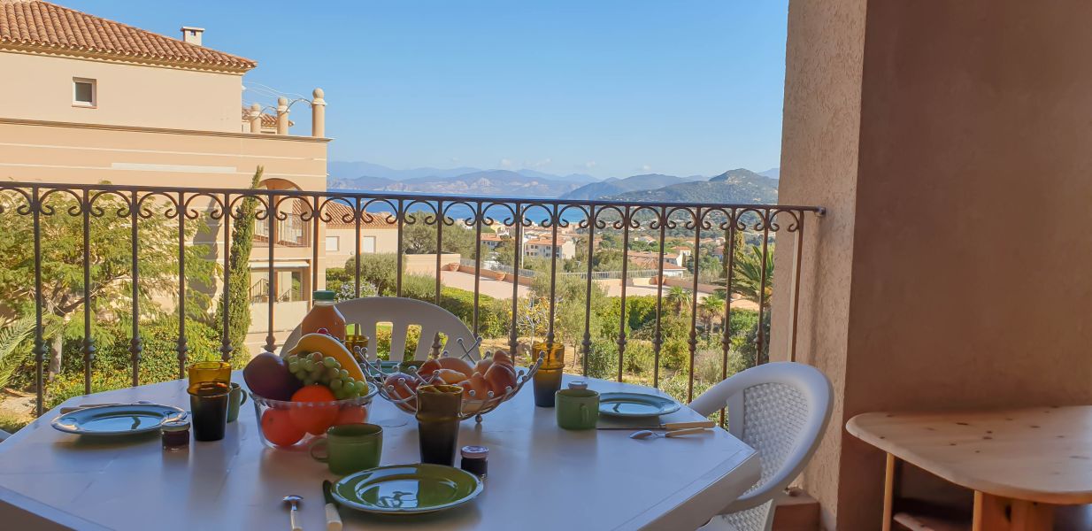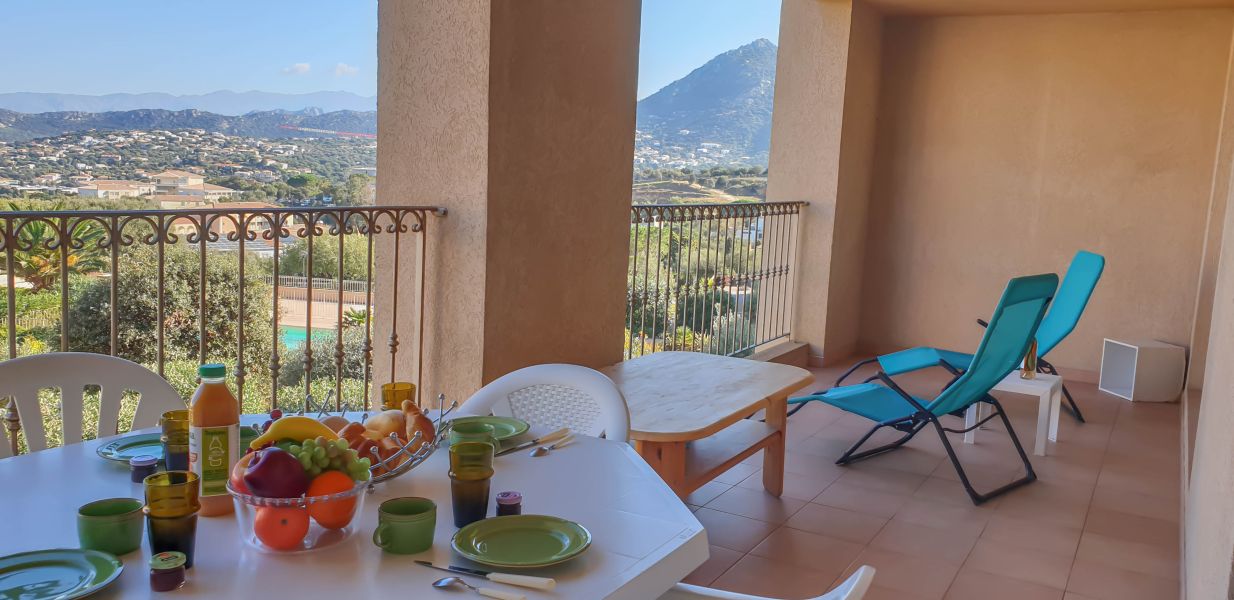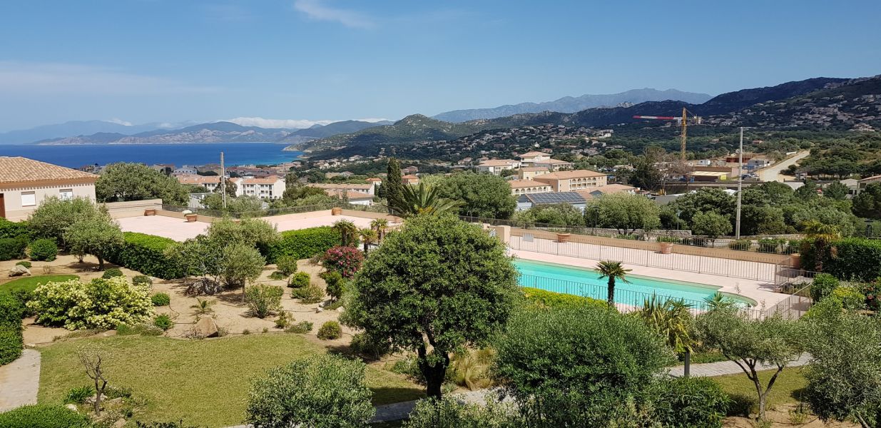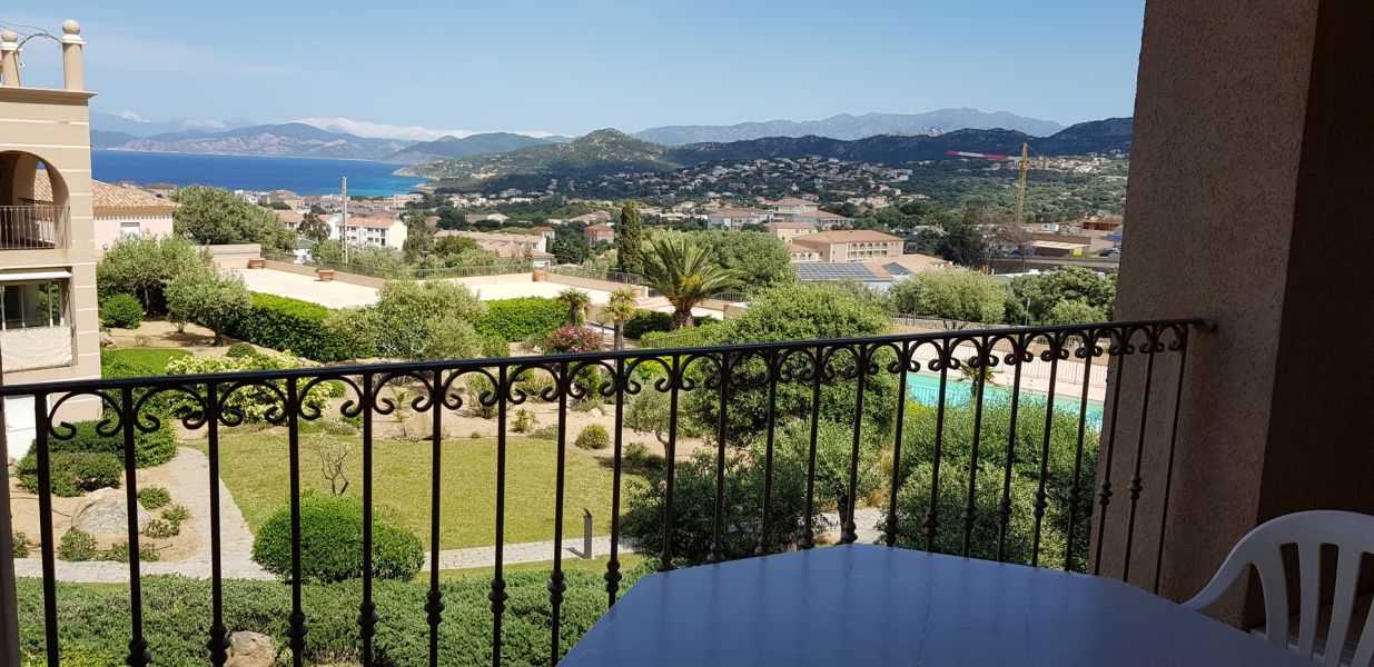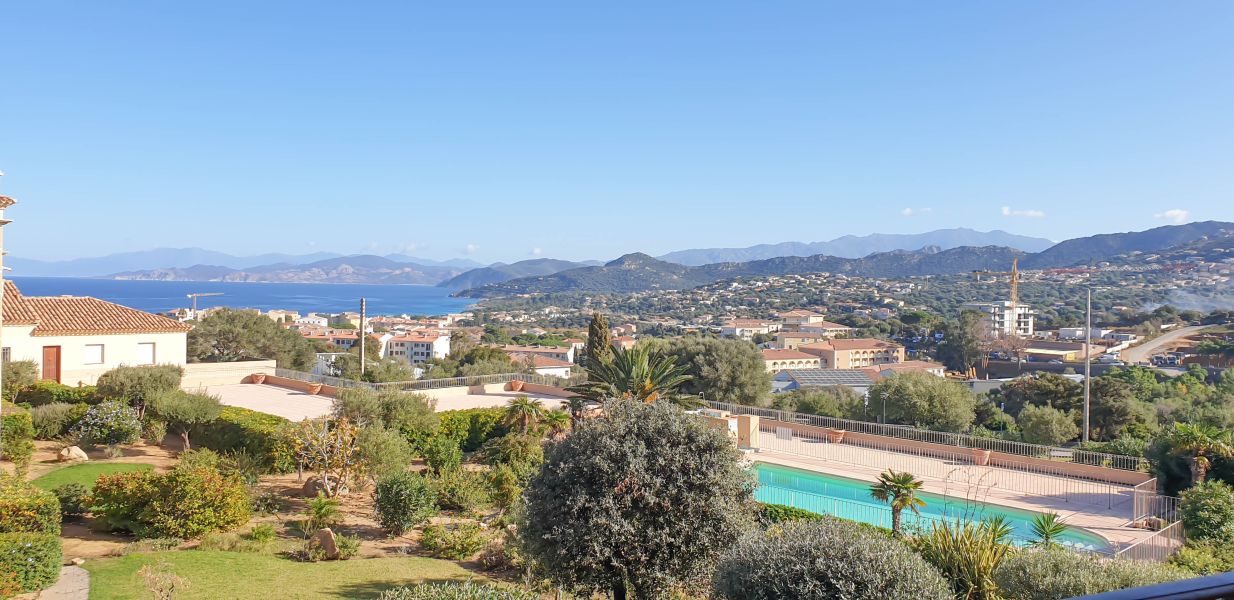 Bel appartement climatisé de 44m², dans une résidence avec piscine commune, proche d'un centre commercial, au 1er étage sans ascenceur avec une vue sur Ile Rousse et la mer.