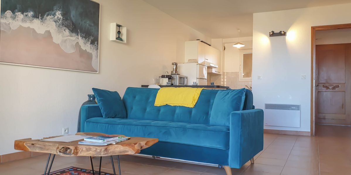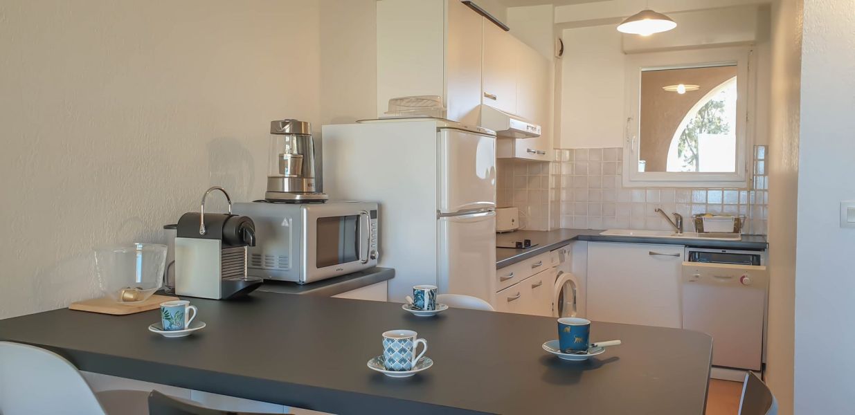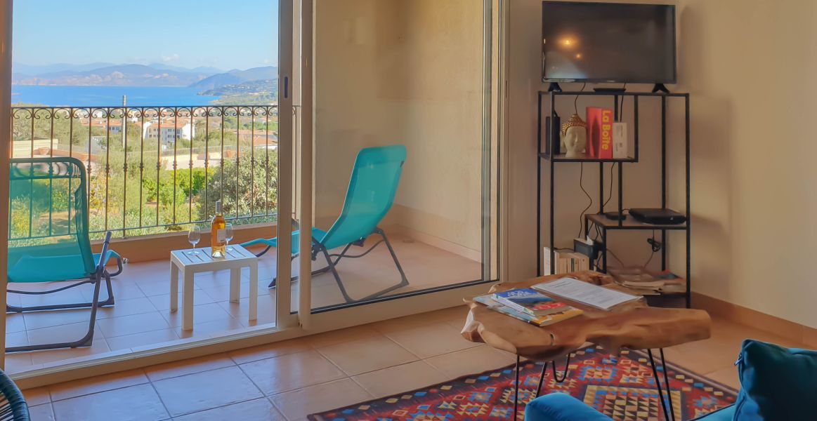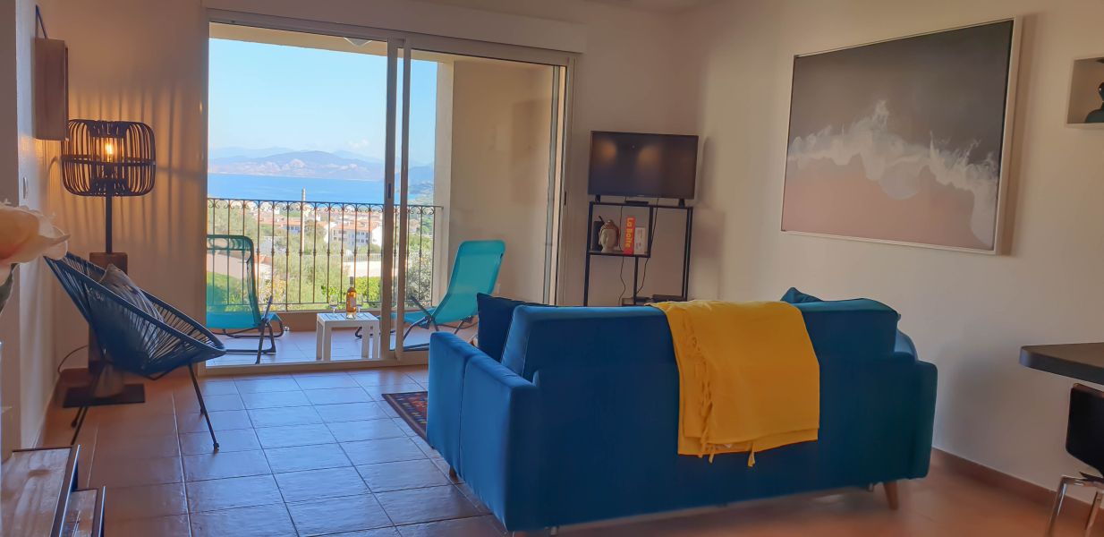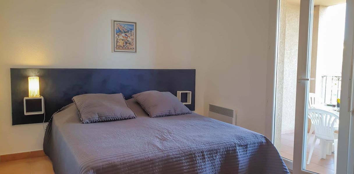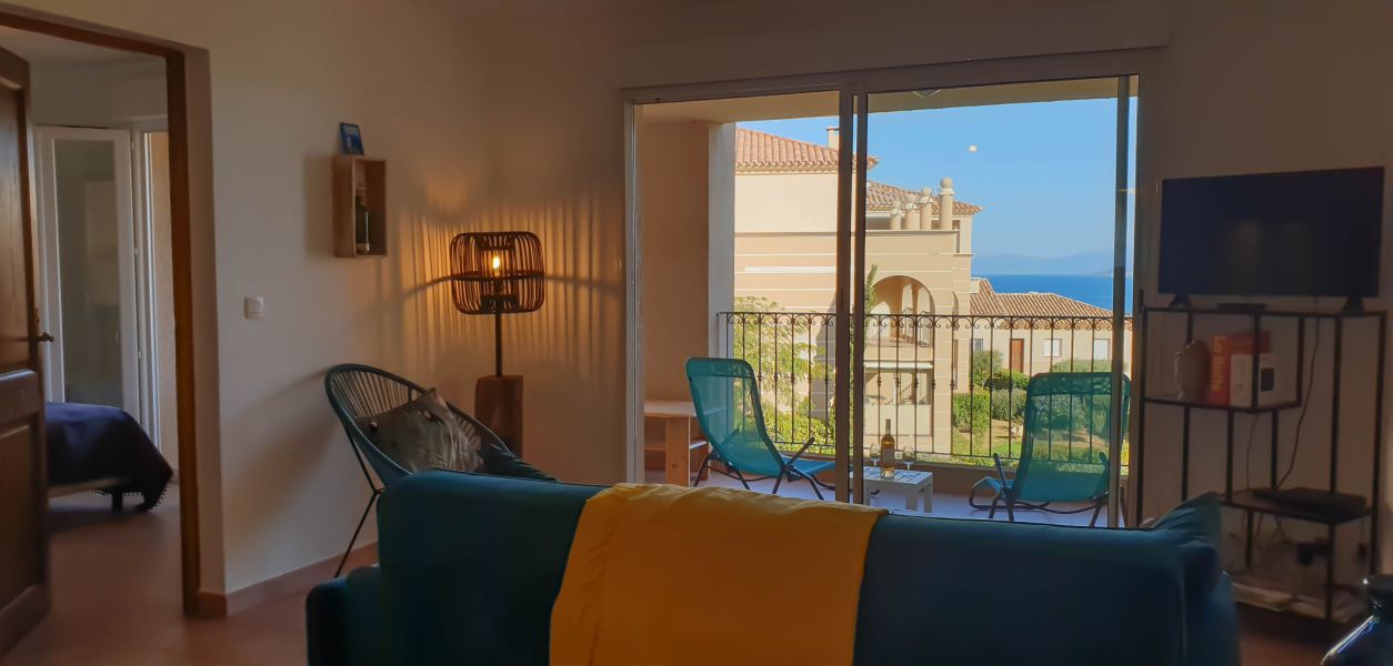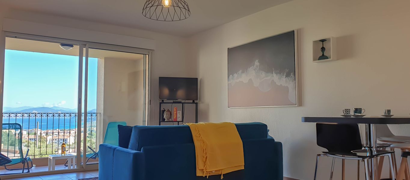 Bel appartement climatisé de 44m², dans une résidence avec piscine commune, proche d'un centre commercial, au 1er étage sans ascenceur avec une vue sur Ile Rousse et la mer.