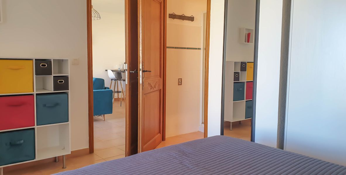 Une chambre avec un lit double en 160 et une salle d'eau attenante, placard.