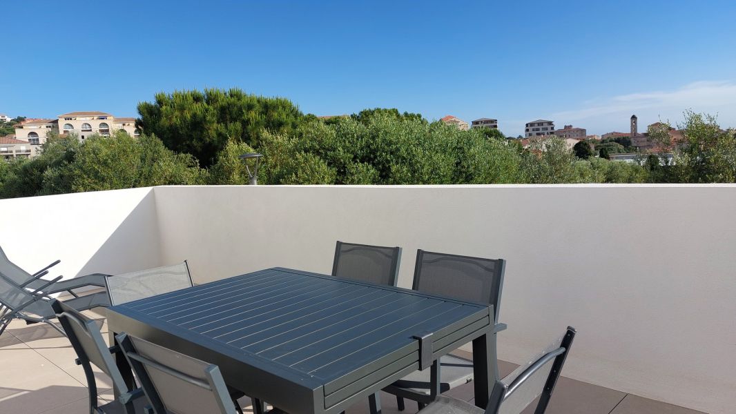 Bel appartement au premier et dernier étage en duplex dans une résidence toute neuve, à 5 minutes à pieds du centre d'Ile Rousse et de la plage. Vue sur Ile Rousse.